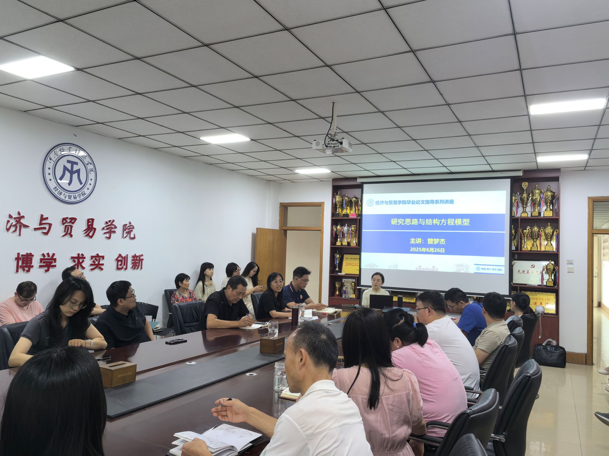 曾老师的讲座围绕实证研究的完整框架、结构方程模型(SEM)的原理与应用等核心内容展开,为教师指导学生开展系统性研究提供了专业指导。曾老师的讲座具体包括以下内容:一是研究思路的系统化构建。曾老师以"提出问题-分析问题-解决问题"为主线,详细讲解了毕业论文各章节的逻辑衔接:(1)绪论写作:强调"问题意识"培养,建议通过"现实矛盾→理论缺口→研究问题"三步法确定选题价值;(2)理论分析:需构建“自变量→中介变量→因变量”的完整理论链条,推荐使用思维导图梳理变量关系;(3)研究设计:要明确研究假设与对应的验证方法,区分探索性与验证性研究设计。二是结构方程模型(SEM)全流程解析。针对经管类论文中日益普及的SEM方法,曾老师进行了深入浅出的讲解:(1)模型优势:可同时处理潜变量、测量误差和多层因果关系,适用于满意度、行为意愿等复杂构念研究);(2)操作演示:通过AMOS软件展示验证性因子分析(CFA)、路径分析等关键步骤;(3)适配度指标:详细解读χ²/df、CFI、RMSEA等核心指标的标准阈值与解读方法;(4)结果呈现:示范如何规范绘制路径系数图并撰写分析报告。三是数据收集与实证分析要点。(1)量表设计:推荐使用成熟量表(如李克特5级或7级量表);(2)样本要求:SEM分析至少需要200个有效样本,建议提前进行效度分析;(3)稳健性检验:可通过Bootstrap法或多群组分析验证模型稳定性。