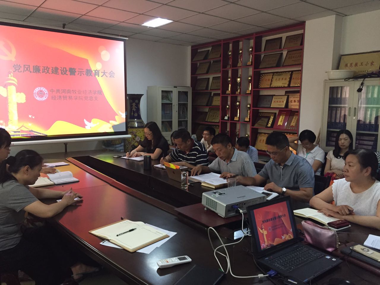 会上,学院牛建绥书记领学了校党委书记穆瑞杰在学校党风廉政建设警示教育大会上的党课报告;传达了校纪委书记李中华《正确行使权力,严防廉政风险》的专题讲话内容,重点解读了教学院、系、部和教师可能存在的廉政风险。并对下一阶段经济贸易学院的党风廉政建设工作和坚持“两学一做”学习教育常态化制度化工作,及校宣传部《关于加强民法总则学习宣传的通知》的文件精神进行了安排。牛书记强调,每一名党员同志都必须把加强党风廉政建设,作为时刻坚持的方针和原则。自觉加强廉政风险防控,规范权力运行,筑牢拒腐防变意识,以案为鉴、警钟长鸣,真正做一个党放心、人民满意的党员。