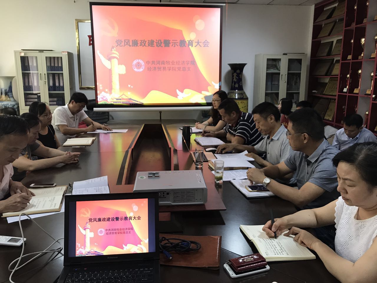 6月22日下午,经济贸易学院在英才校区教学办公楼216会议室召开全体教职工会议,认真学习贯彻学校党风廉政建设警示教育大会精神。会议由李光院长主持。