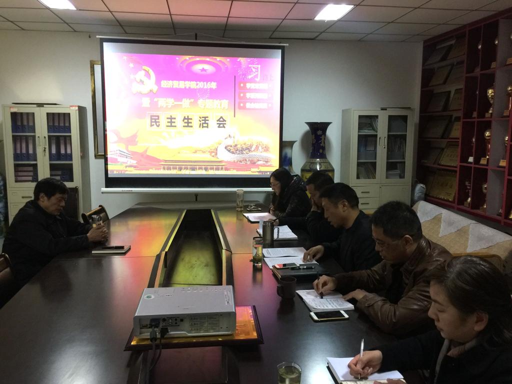 根据«河商牧业经济学院关于开展“两学一做”学习教育的实施方案»的要求,按照《经济贸易学院2016年暨“两学一做”学习教育专题民主生活会实施方案》的安排, 12月12日下午3:30,经济贸易学院在教学办公楼216会议室召开2016年度曁“两学一做”学习教育专题民主生活会。学校副校长许圣道出席会议,学院领导班子全体成员参加会议。会议由院党总支书记牛建绥主持。