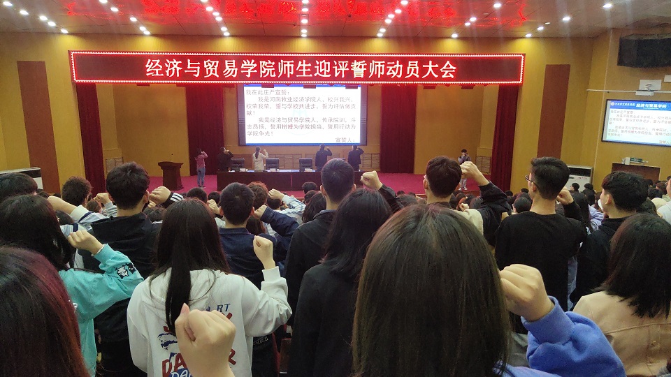 为提高同学们参与迎评的意识与积极性, 4月20日-21日,taptap点点体育在英才校区学术报告厅召开两场“师生迎评誓师动员大会”。taptap点点体育党委书记张松刚,党委副书记贾艳艳,团委书记、学工办主任刘佳楠、团委副书记、学工办副主任申作光、全体辅导员和18级、19级、20级在校生参加。龙子湖校区在校生通过在线直播方式参与。大会由院党委副书记贾艳艳主持。