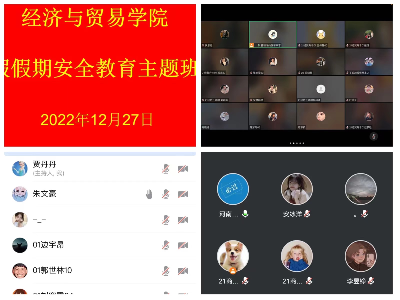 在班会上,各带班辅导员首先强调在后疫情时代一定要注意个人防护,合理规划作息时间,加强身体锻炼,做自身健康的第一责任人。其次,要提高假期安全防范意识。假期中不与社会闲散人员来往,不到有安全隐患的地方游玩,防止各类安全事故发生。假期勤工助学时,做好个人防护,增强法律意识和防盗、防骗意识,提高自我保护能力。再次,假期中要自觉遵守社会公德,增进家人情感交流。假期中无论身在何地,要做到遵纪守法,崇尚科学,不参加任何封建迷信活动,不参与任何非法集会活动,做文明大学生;自觉承担子女责任,利用假期多陪伴家人,用力所能及的实际行动感恩父母,在情感交流和家务劳动中增进亲情。最后,各辅导员老师向学生们强调了开学事宜,根据疫情防控形势,学校将通过官方平台第一时间发布2023年春季开学的具体时间及返校要求,辅导员老师将第一时间通知到位,在未接到正式通知时不得提前返校。