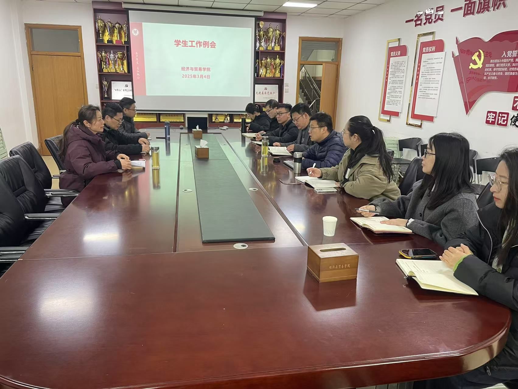 针对本学期的学生工作,贾艳艳就毕业生就业、学风建设、网络宣传、党团发展、宗教理论知识学习、学雷锋志愿服务、运动会、心理健康月、毕业生晚会等做了统筹谋划与具体安排。