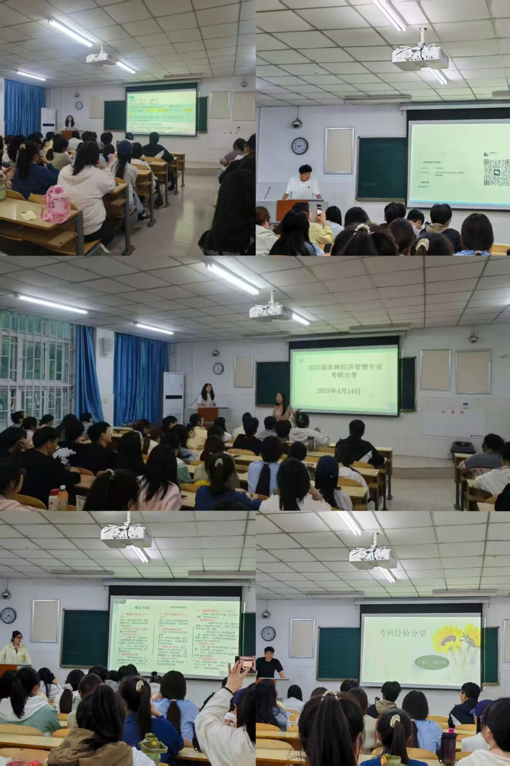 会上,农业经济教研室吴静老师首先向同学们介绍了过去一两年来农林经济管理专业本科生的考研及就业情况,鼓励同学们保持考研热情,努力争取更好的成绩。随后,2025届农林经济管理专业01班的杨雨琪、程谊梦、李民、张磊森、曾梓宸同学分别结合自身经历,为同学们带来了实用的备考经验。考研嘉宾针对农村发展、农业管理、农林经济管理不同方向从备考规划、学习方法、院校选择等方面进行了详细讲解,强调了明确目标和坚持努力的重要性。考公同学则分享了备考、笔试和面试技巧,指出心理素质和应变能力在考公中的关键作用。多位同学都鼓励大家积极参与农业调研项目、农村经济实践活动,以提升在考研考公面试中的竞争力。这些分享不仅让同学们对考研考公有了清晰的认识,更为农林经济管理专业学生未来的职业发展提供了方向。会后分享嘉宾耐心解答了关于农林经济管理专业考研考公的诸多问题,有效解决了同学们的备考迷茫,增强了信心。